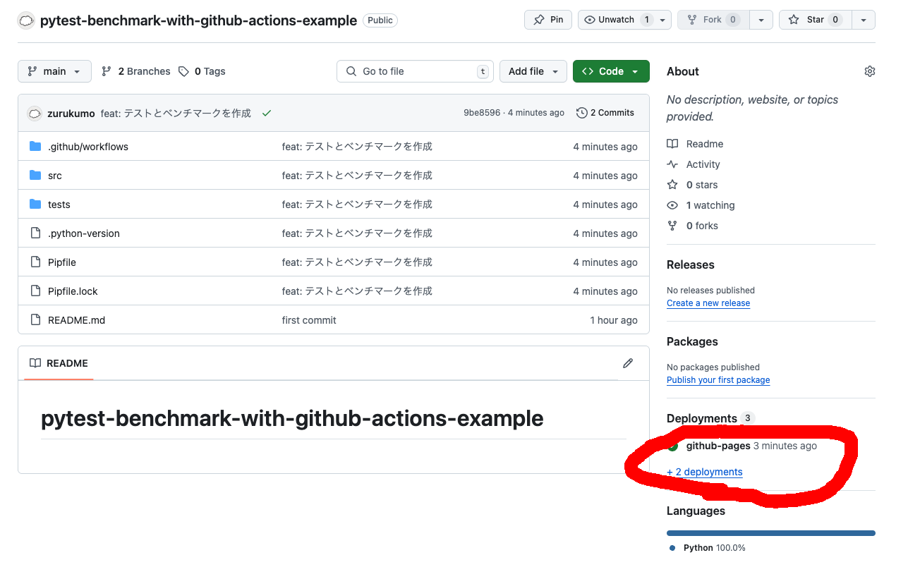 auto-push: trueと書くことで、前段のpipenv run benchmarkで出力したoutput.jsonをHTMLファイルに変換して、GitHub Pagesにデプロイしてくれる。